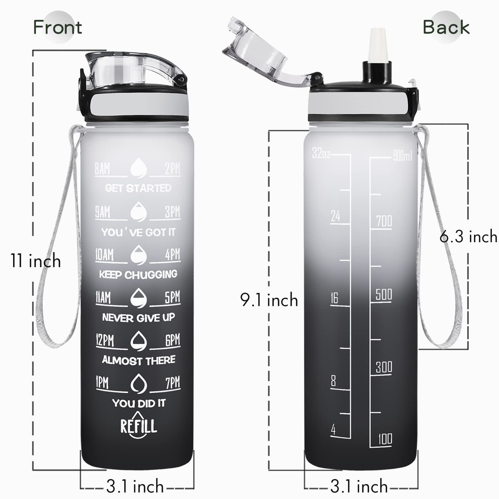 - 【Humanized Design】Water bottles with times to drink can quick open with one hand. The flip-top lid is used a secure lock, making it dust-free and leak-proof. Time water bottle is portable, light, and easy to use.