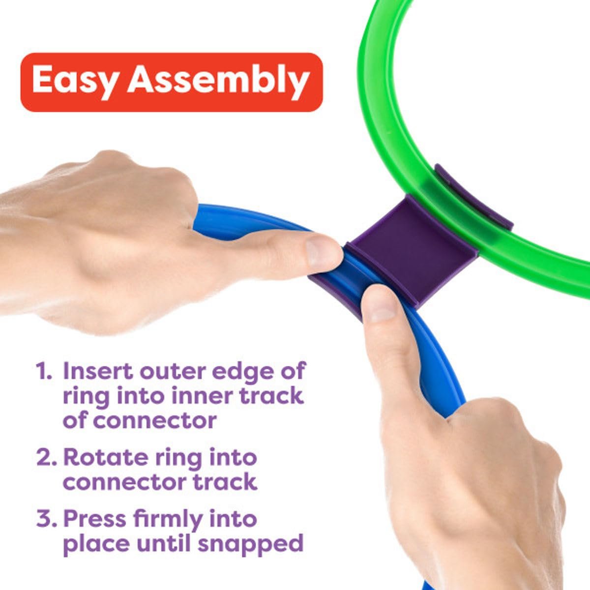 - SET OF 10 – The set comes with 10 multi-colored rings and 15 easy snap connectors that can be set up in a variety of configurations, encouraging your child to use their imagination to invent new ways to jump and play.