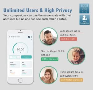 - 【Support Unlimited Users】 Allows your families to share one scale together via their own mobile devices while the data was stored ONLY in their mobile. 4 high precision sensitive electrodes, step on technology, auto-calibration, low fat and high fat Indication.
