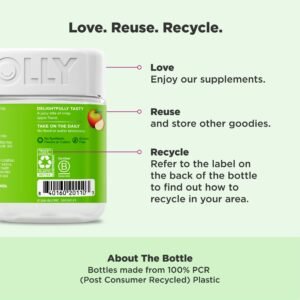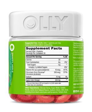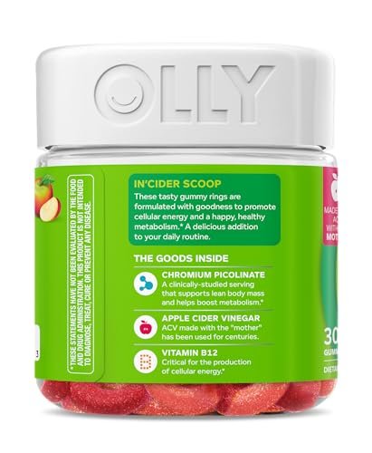 Details: OLLY Metabolsim Gummy rings are formulated with goodness to promote cellular energy and a happy, healthy metabolism.* They’re expertly blended with Chromium Picolinate, a clinically-studied amount that supports lean body mass‡ and helps boost metabolism, Vitamin B12 for cellular energy production and Apple Cider Vinegar with the Mother. The gummy rings come in a super delicious Snappy Apple flavor with other natural flavors, so you get Apple Cider Vinegar without having to drink it. No synthetic flavors or colors, and they’re gluten-free. Adults, take 1 gummy per day. Chew thoroughly before swallowing.* At OLLY, good health is at the center of everything we do. We create delightful vitamins and supplements with real-deal benefits that help you live Happy Inside Out. ‡With a healthy lifestyle, including exercise. *These statements have not been evaluated by the Food and Drug Administration. This product is not intended to diagnose, treat, cure or prevent any disease.