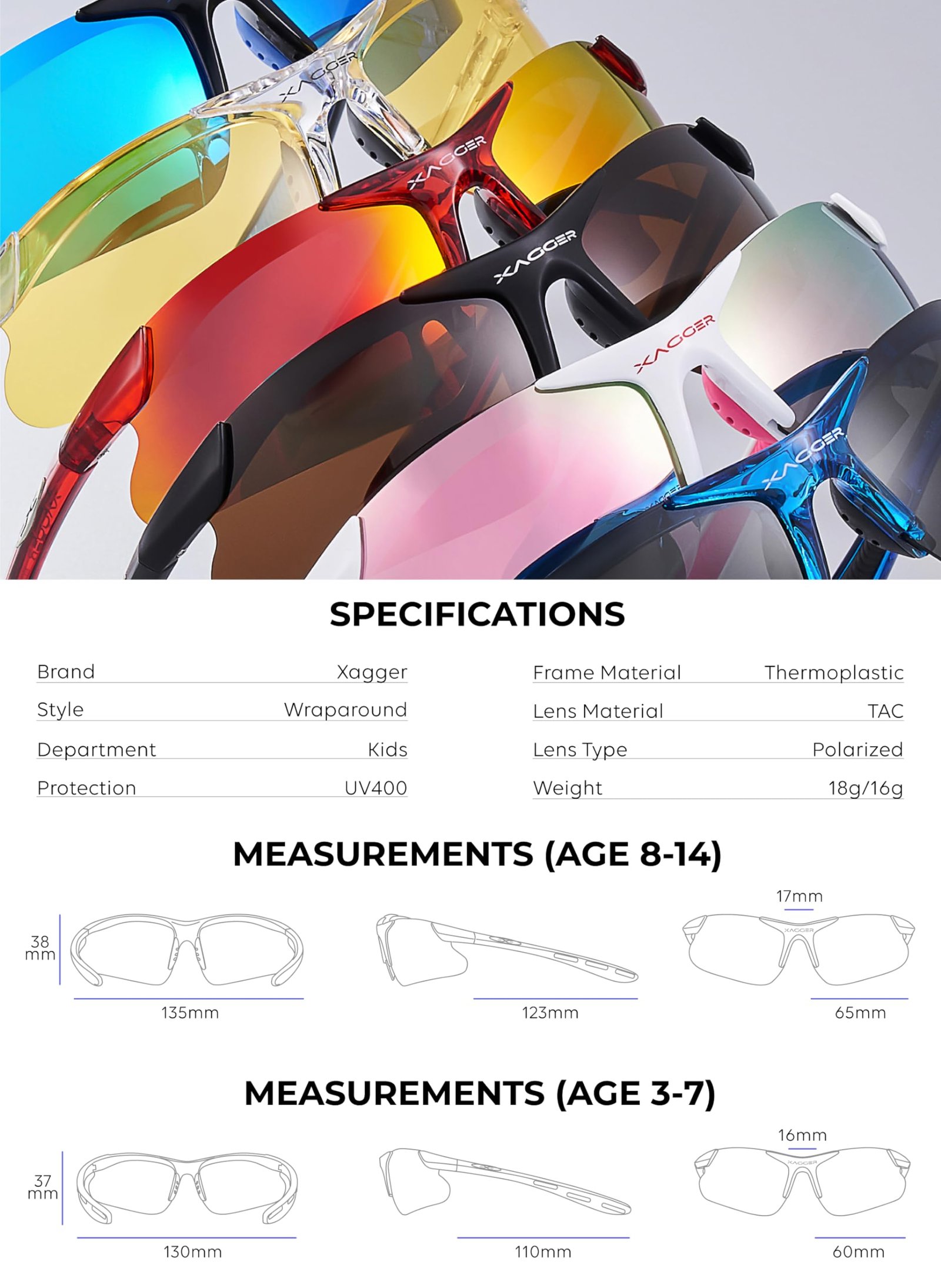 • ESSENTIAL UV400 PROTECTION: Help your kid enjoy the sun all day long without worrying about the sun’s harmful UV rays! The Xagger polarized lens features a UV400 filter, which offers reliable UVA & UVB protection for children’s eyes.