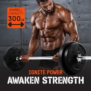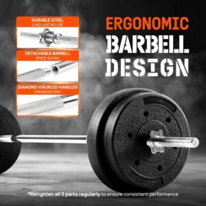 - DETACHABLE BARBELL FOR EASY STORAGE: Designed for quick assembly, the bar with weights set is easy to store; Ideal for home gyms, the space-saving detachable straight barbell allows for convenient use, ensures portability, ideal for small spaces