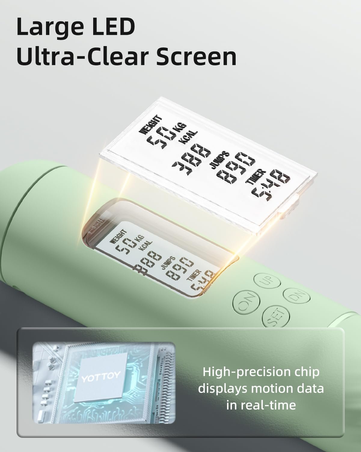 • 1.YOTTOY Jump Rope: We are dedicated to developing high-quality lightweight sports products. Our Electric Jump Rope features an HD LED display that shows the Timer, Weight, Calorie, and Circles. Set your weight and track time, number of jumps, and calories burned to achieve your fitness goals more effectively.